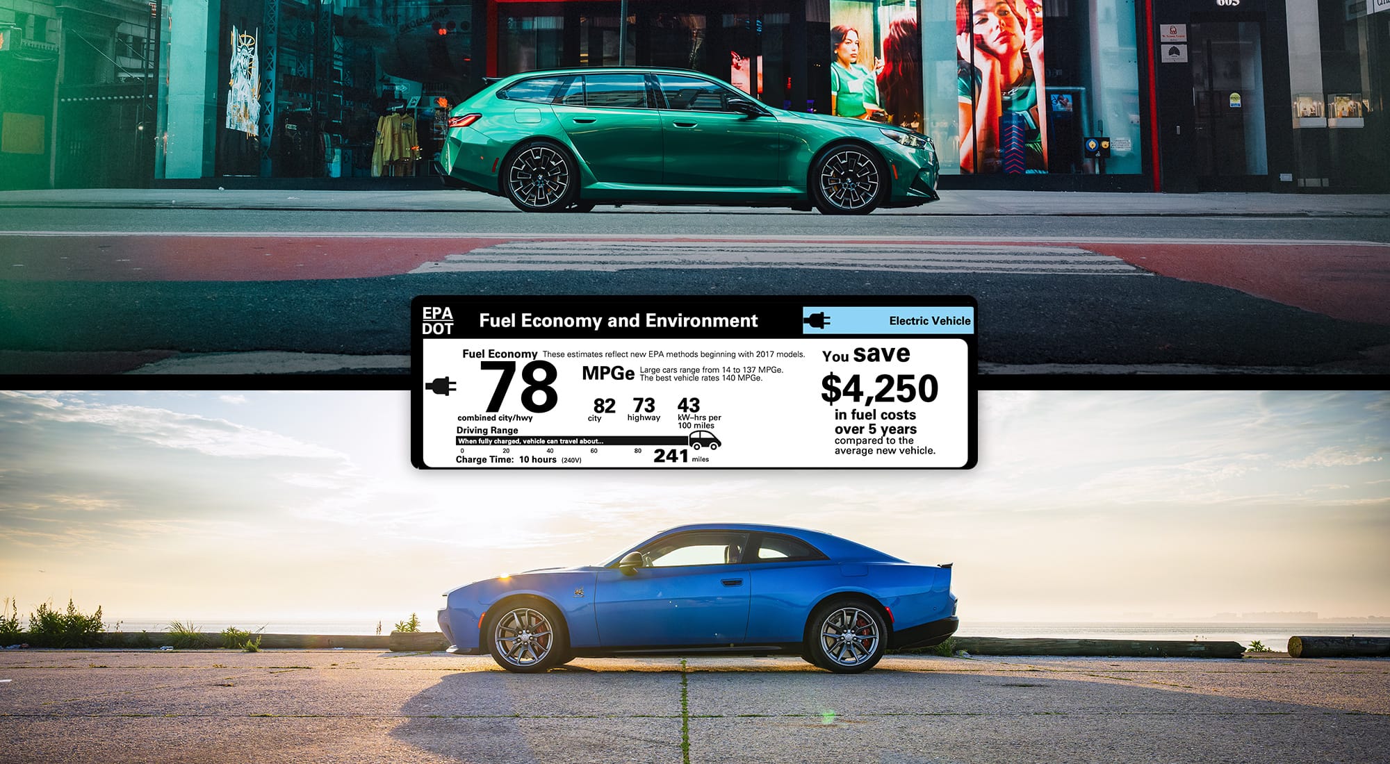 - The Charger is fully electric, with a 78 MPGe combined rating and a range of 216 miles.